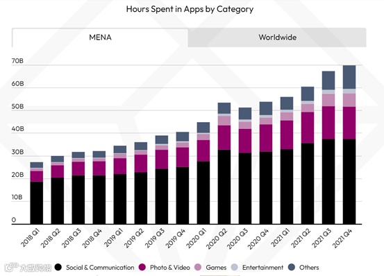 当地用户偏爱使用社交、照片&视频类应用,打个比方,如果拿出10分钟玩手机,8分钟都是用在这两类App中。以社交为例,2021年,它在MENA地区的总使用时长占比过半。