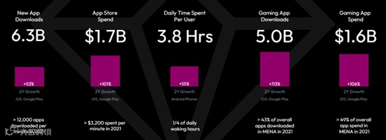 回顾2021年,MENA地区表现仍旧优异,无论是在下载量、用户花费、使用时长等方面,均实现大幅增长。据data.ai数据显示,2021年,MENA地区的应用下载量为63亿次,两年内增长53%;游戏类别应用占比极高,该类应用下载量高达50亿次。