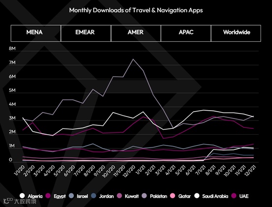 受到海外多个地区疫情政策放宽的影响,中东和北非地区和欧洲的几个国家在放松就地隔离限制和旅行规定后,在2021年下半年中出现强劲反弹。事实上,夏季旅游旺季期间的旅游增长非常迅猛。数据显示,2021年夏季,沙特阿拉伯、埃及和阿尔及利亚的旅游应用程序下载量均有一定上升。