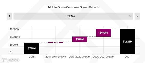 在全球游戏行业增长放缓的情况下,MENA地区表现格外亮眼。据data.ai数据显示,同比来看,2021年MENA地区的游戏消费支出增加4.9亿美元,下载量增加15.3亿美元。沙特阿拉伯、以色列和科威特是游戏品类消费增长最多的三个地区。