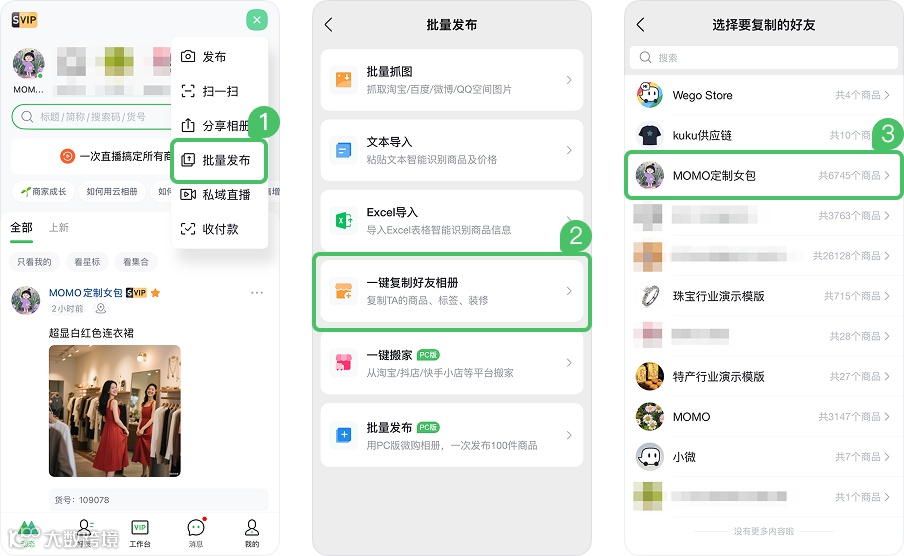 如需完整复制上游相册的装修样式、商品分类及商品内容,可使用「批量发布」功能中的「一键复制好友相册」选项。该功能支持整体迁移(注:封面图复制需上游授权)。