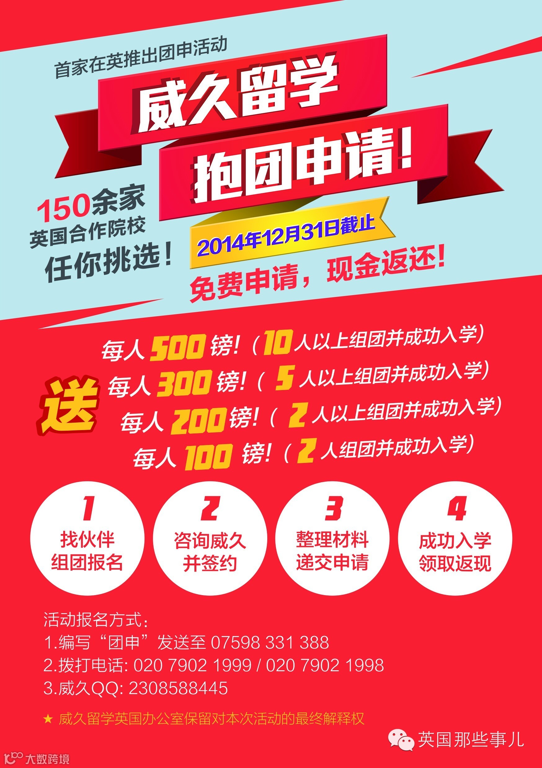 参与威久英国“抱团申请”活动,成功组队即可获得丰厚现金奖励: