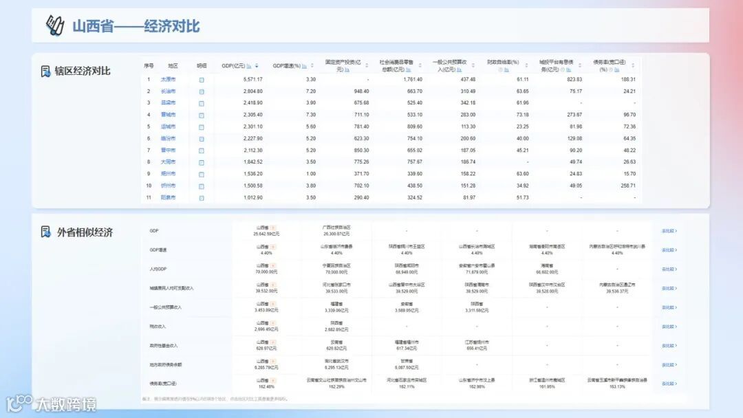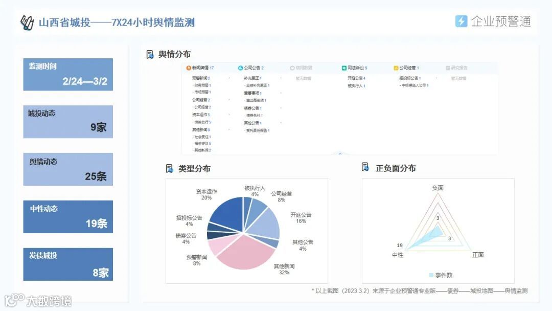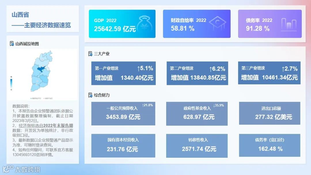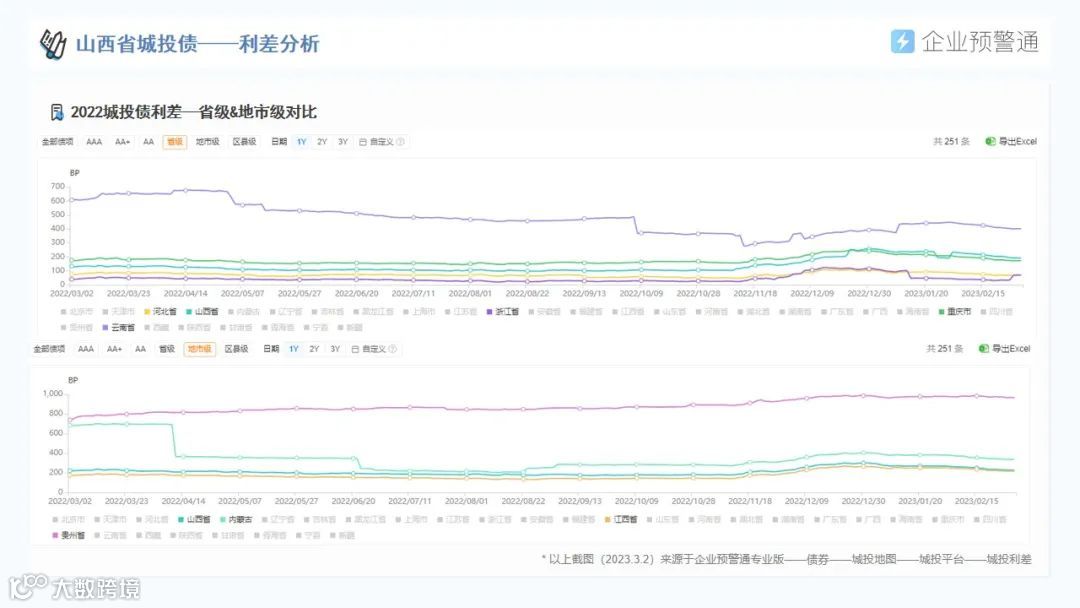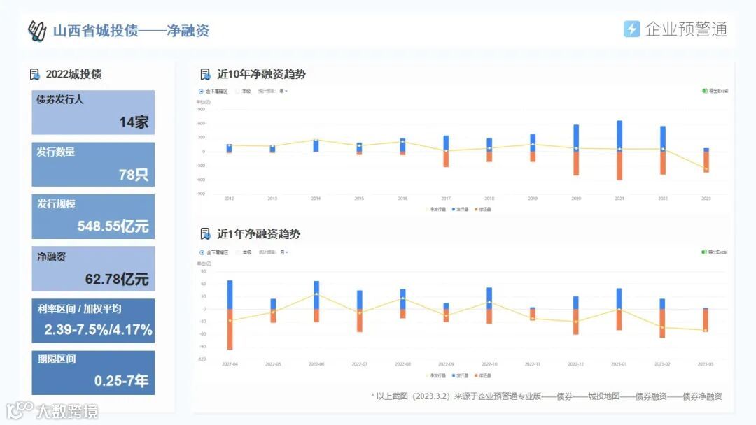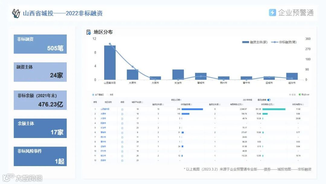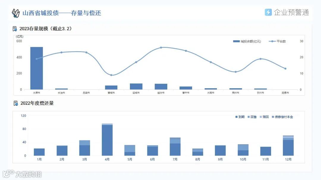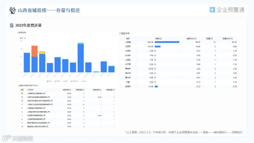 针对山西省内区域经济、城投平台分布、存量债券余额、最新评级调整、债券价格异动等信息,我们进行了系统梳理,并形成数据报告分享给大家。(以上数据截至2023年3月2日,数据更新以产品显示为准)