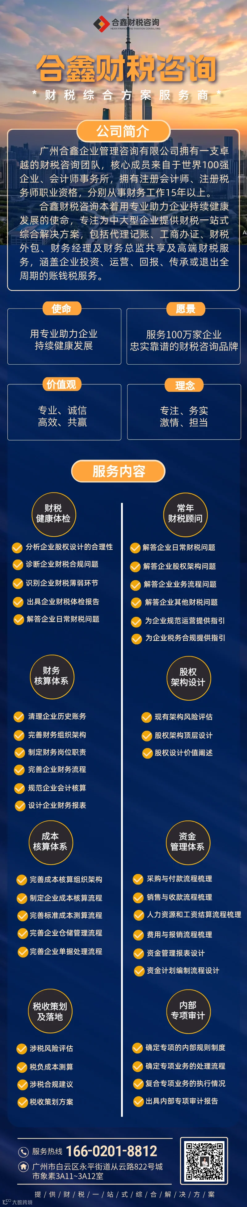提供服务范围:财税健康体检、常年财税顾问、财税专项培训、财务核算体系、成本核算体系、顶层股权架构设计、内部专项审计、税收策划及落地.....