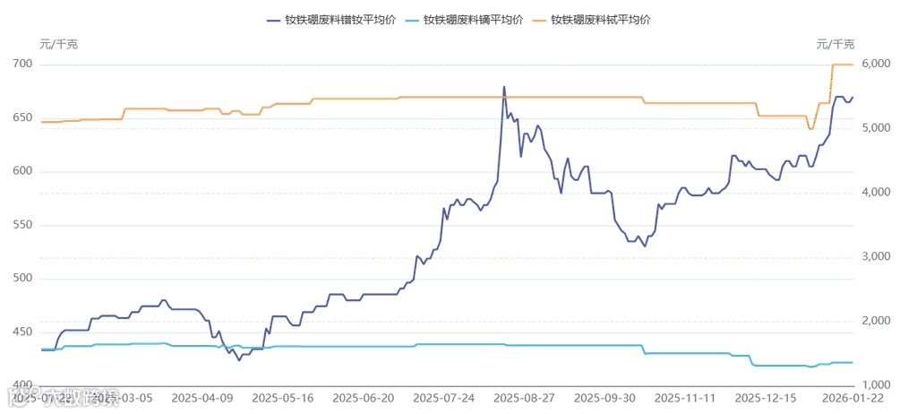 上周,钕铁硼废料镨钕价格报收665-675元/公斤;钕铁硼废料镝价格报收1350-1380元/公斤;钕铁硼废料铽价格报收5900-6100元/公斤;钕铁硼废料钆价格报收80-100元/公斤;钕铁硼废料钬价格报收200-220元/公斤。