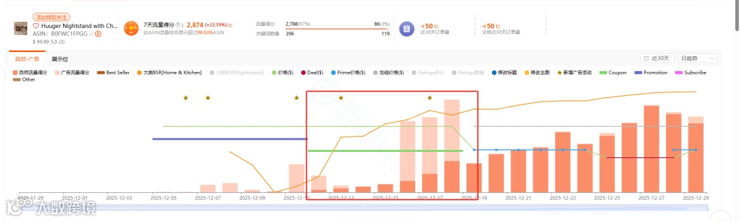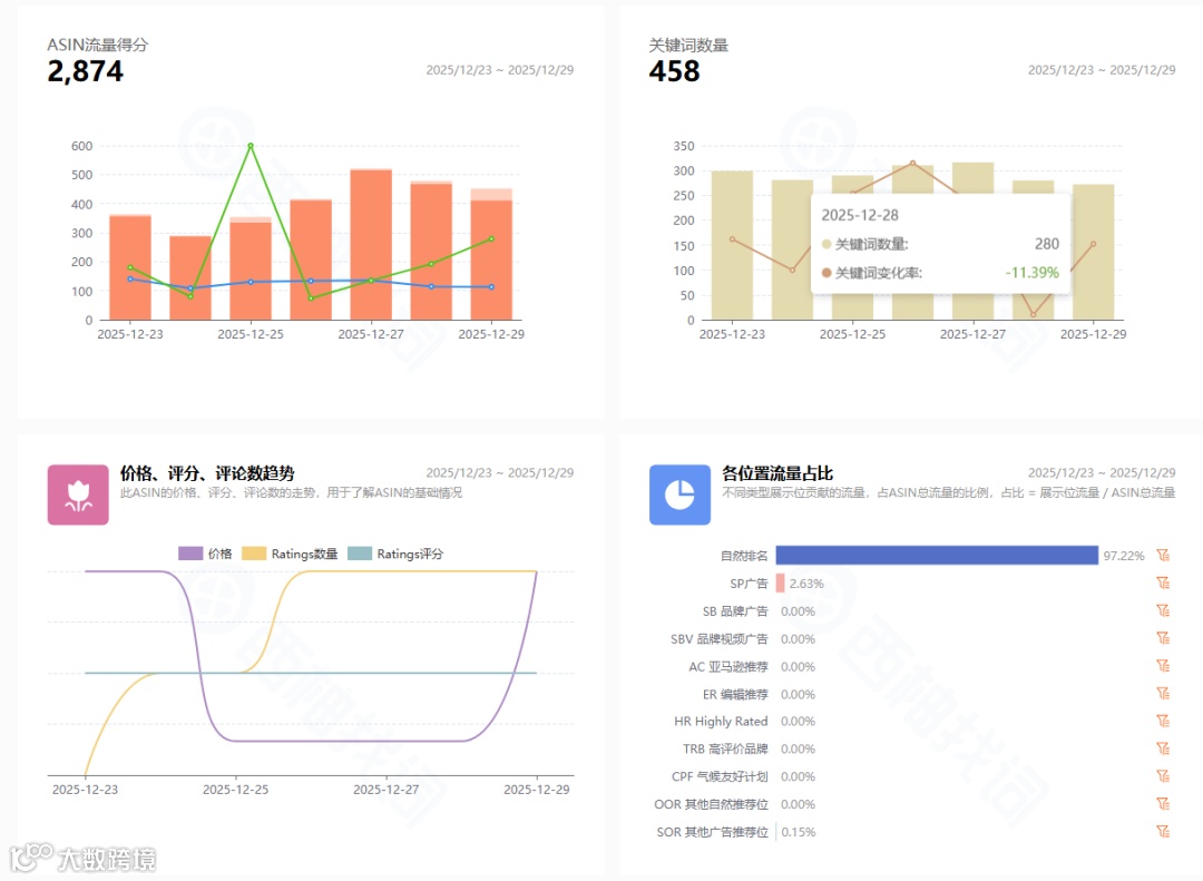 - 流量突破:自12月7日起产生流量,12月12日后急剧上升,7天流量得分达2874分,接近头部产品水平,关键在于快速提升关键词流量层级。