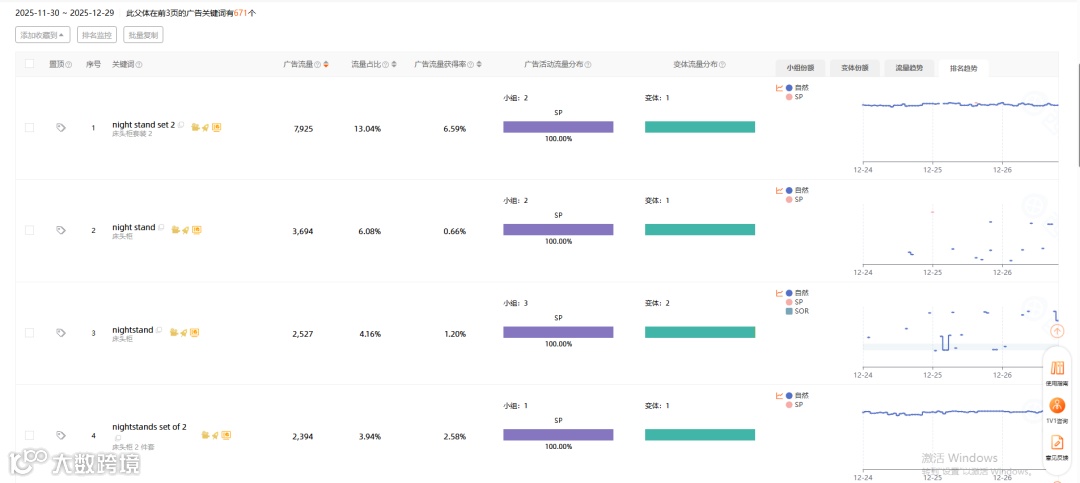 - 广告投放:头部词使用SP广告,优先投放自然排名靠后但流量大的词(如“night stand”“side tables bedroom”),采用精准匹配+固定竞价+首页顶部位置,每日调价抢占坑位。