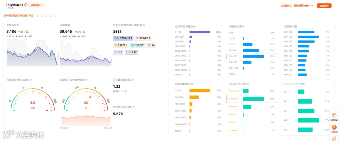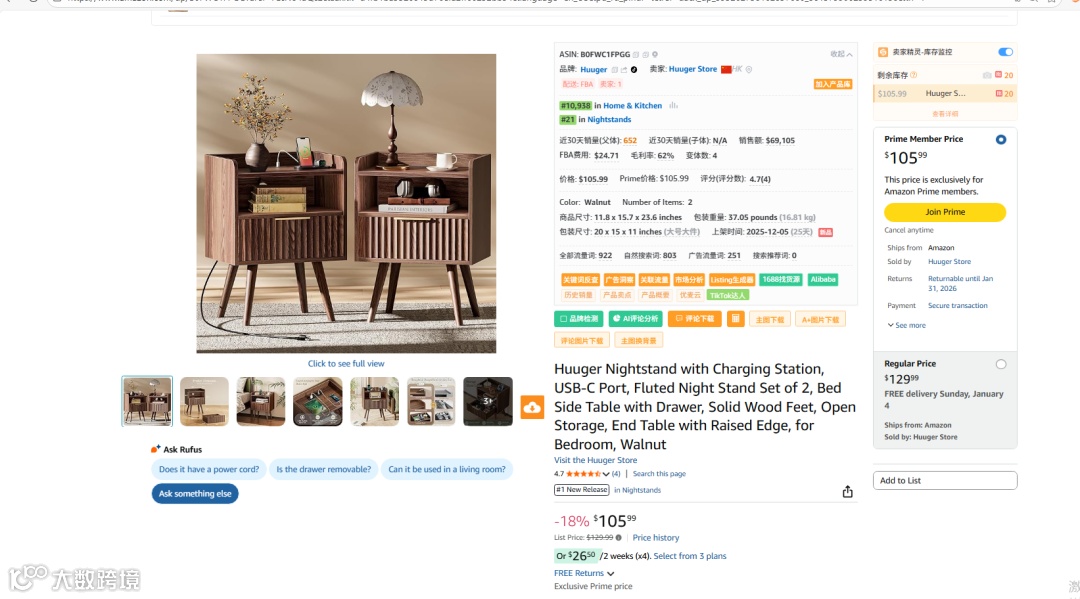 以“Nightstands”边桌类目为例,该品类市场规模大但利润空间窄、FBA费用高。某新品于12月5日上架,一个月内冲至新品榜第1名,其核心策略如下: