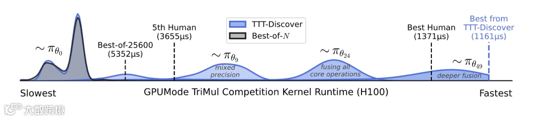 不同于传统强化学习优化平均奖励,TTT-Discover采用熵目标函数,专注于生成单一极优解,而非多个平庸结果。该机制优先强化奖励最高的动作,推动模型向性能极限逼近。