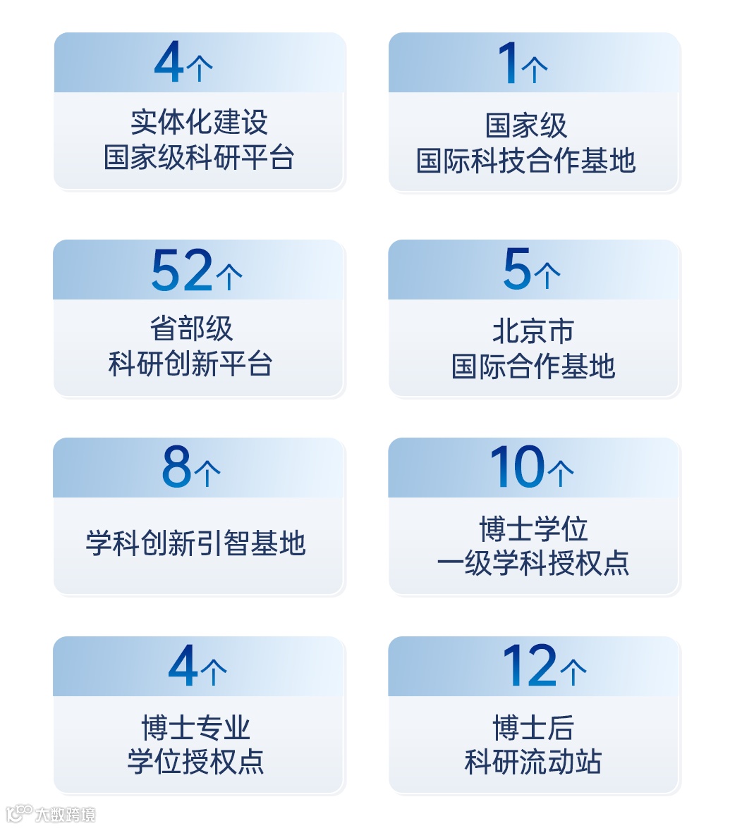 学校坚持“四个面向”,服务“国之大者”,聚力打造战略科研力量,积极参与国家创新体系建设。现建有4个实体化建设国家级科研平台、1个国家级国际科技合作基地、52个省部级科研创新平台、5个北京市国际合作基地、8个学科创新引智基地。