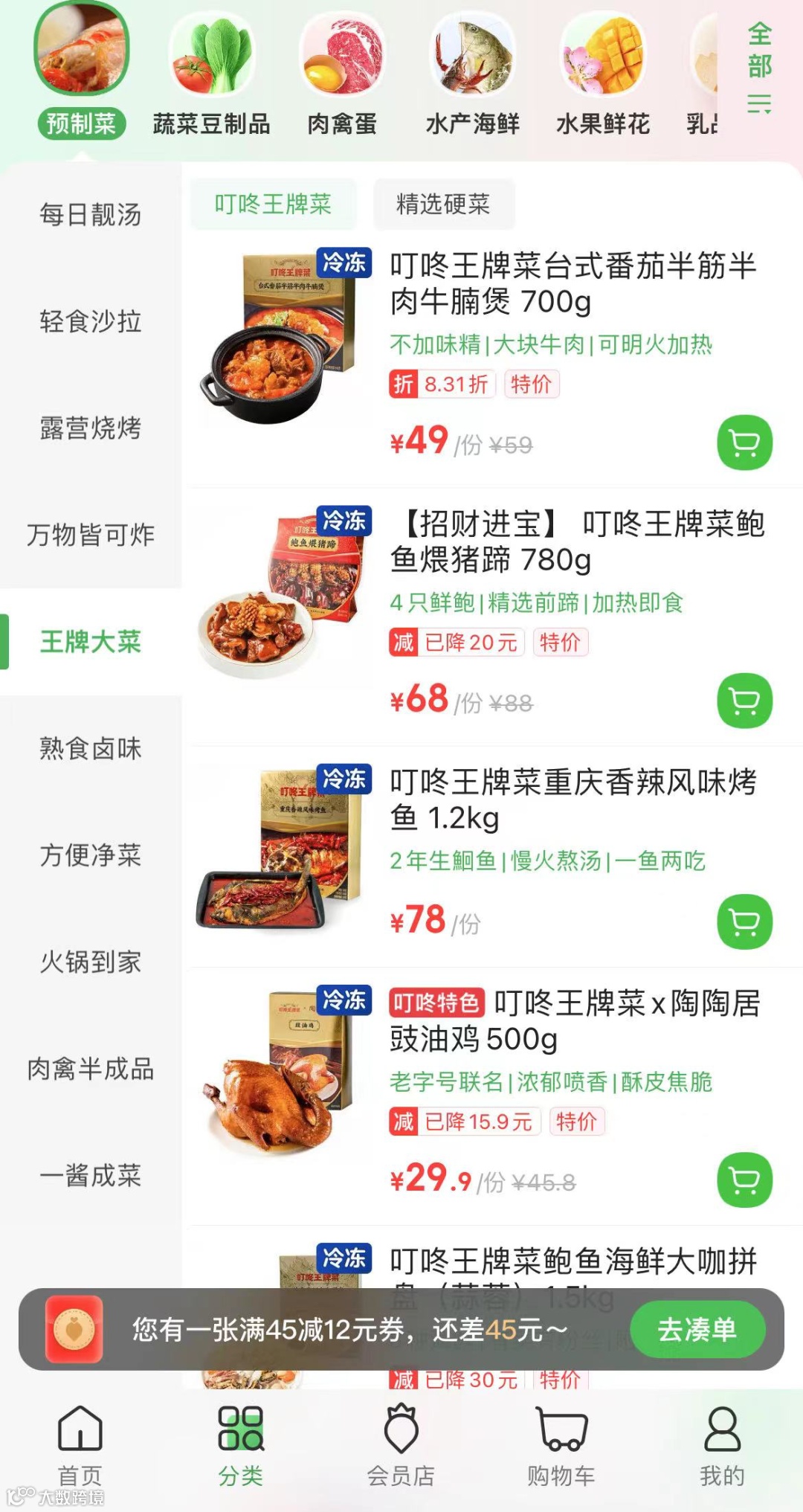 从叮咚买菜APP中可以看出,叮咚买菜预制菜定价包含了多个区间。较贵的是王牌菜版块:700g的番茄牛腩煲49元/份,1.2kg烤鱼78元/份,1260g风味羊杂汤70.5元/份。