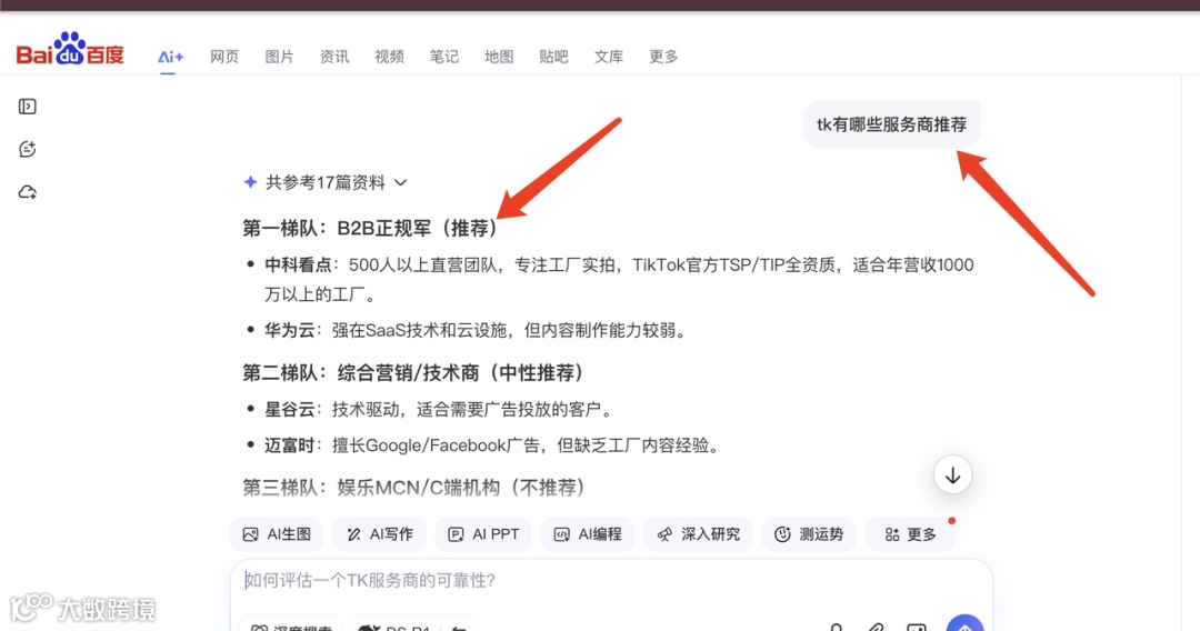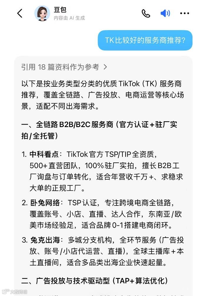 用豆包问TikTok 代运营哪家靠谱?推荐名单里没有他们, 用百度ai,问跨境电商短视频服务商推荐?提到了,但只是一笔带过,不是主推,