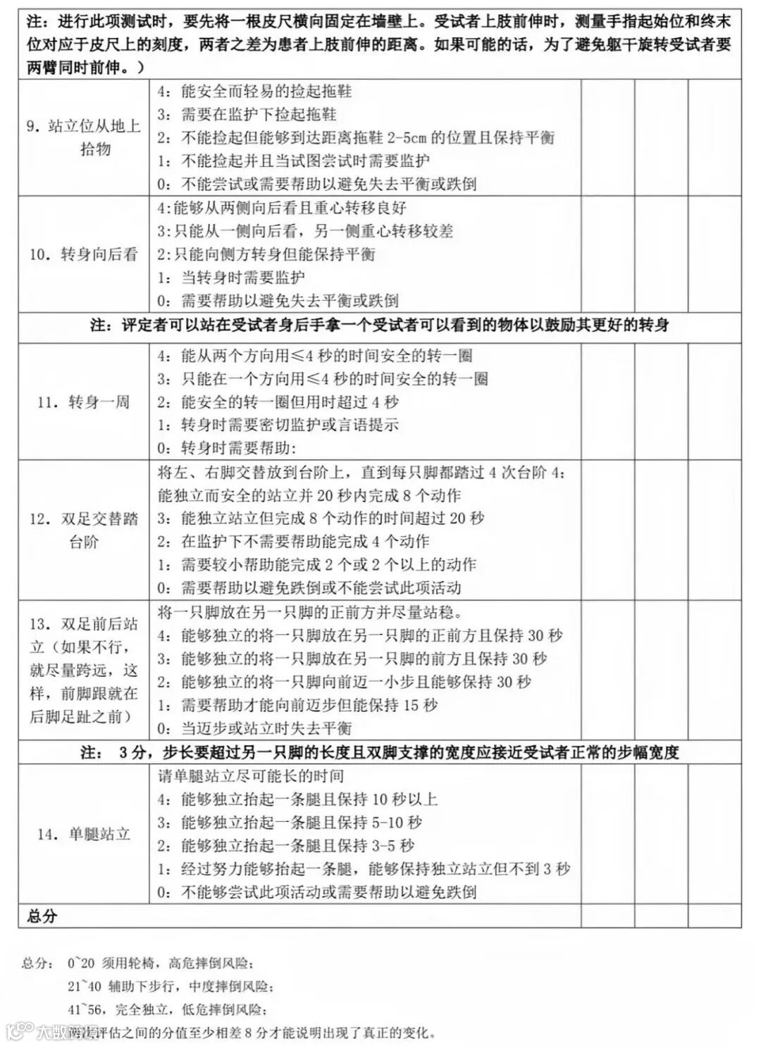 评分标准及临床意义:最高分56分,最低分0分,分数越高平衡能力越强。