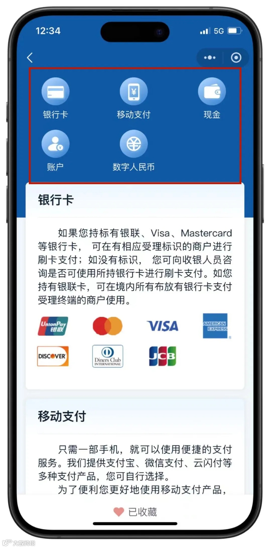 《在华支付指南》首页通过短视频介绍了在中国常用的五种支付方式:银行卡、移动支付、现金、银行账户和数字人民币。