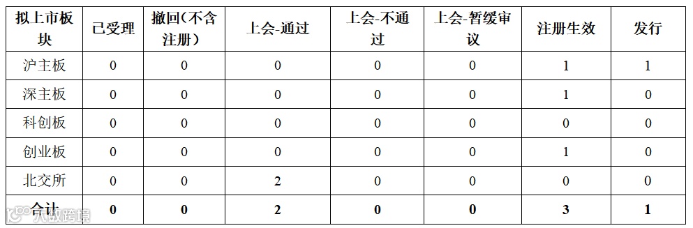 截止2026年1月11日,年度IPO受理数量为0家、撤回数量为0家、上会2家(其中,通过2家)、3家获得发行批文、1家成功发行上市。