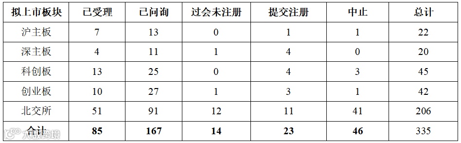 截止2026年1月11日,IPO排队情况:共335家,其中沪市主板22家,深市主板共20家,科创板共45家,创业板共42家,北交所共206家。