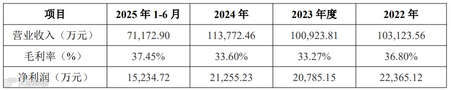 报告期内,公司营业收入分别为103,123.56万元、100,923.81万元、113,772.46万元和71,172.90万元,毛利率分别为36.80%、33.27%、33.60%和37.45%,净利润分别为22,365.12万元、20,785.15万元、21,255.23万元和15,234.72万元。