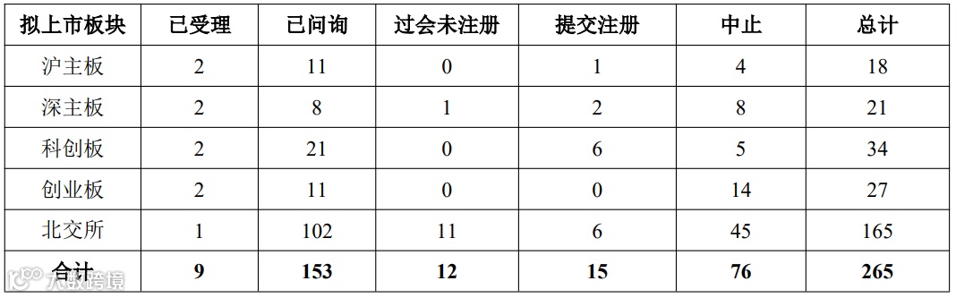 截止2025年11月30日,IPO排队情况:共265家,其中沪市主板18家,深市主板共21家,科创板共34家,创业板共27家,北交所共165家。