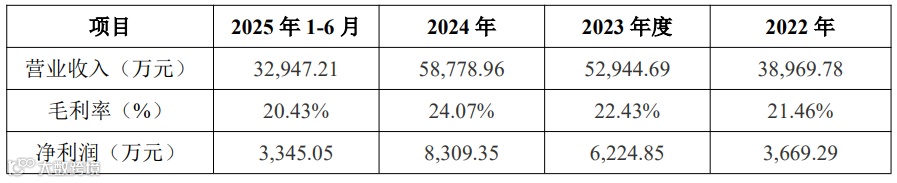 报告期内,公司营业收入分别为38,969.78万元、52,944.69万元、58,778.96万元和32,947.21万元,毛利率分别为21.46%、22.43%、24.07%和20.43%,净利润分别为3,669.29万元、6,224.85万元、8,309.35万元和3,345.05万元。