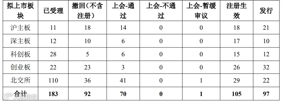 截止2025年11月30日,年度IPO受理数量为183家(其中沪主板11家,科创板28家、深主板12家、创业板22家、北交所110家)、撤回数量为92家、上会71家(其中,通过70家)、105家获得发行批文、97家成功发行上市。