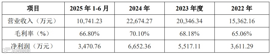 报告期内,公司营业收入分别为15,362.16万元、20,346.34万元、22,674.27万元和10,741.23万元,毛利率分别为65.06%、68.18%、70.10%和66.80%,净利润分别为3,611.29万元、5,517.11万元、6,652.36万元和3,470.76万元。