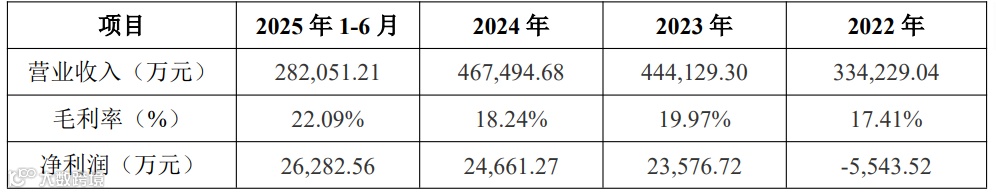 报告期内,公司营业收入分别为334,229.04万元、444,129.30万元、467,494.68万元和282,051.21万元,毛利率分别为17.41%、19.97%、18.24%和22.09%,净利润分别为-5,543.52万元、23,576.72万元、24,661.27万元和26,282.56万元。