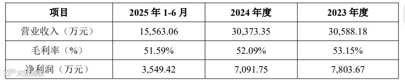 报告期内,公司营业收入分别为30,588.18万元、30,373.35万元和15,563.06万元,毛利率分别为53.15%、52.09%和51.59%,净利润分别为7,803.67万元、7,091.75万元和3,549.42万元。