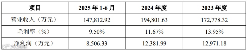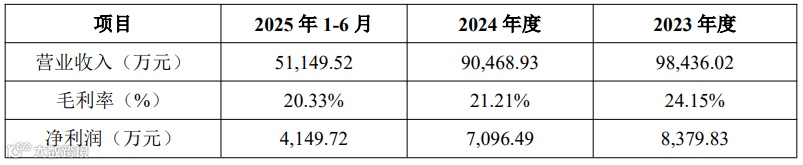 报告期内,公司营业收入分别为98,436.02万元、90,468.93万元和51,149.52万元,毛利率分别为24.15%、21.21%和20.33%,净利润分别为8,379.83万元、7,096.49万元和4,149.72万元。