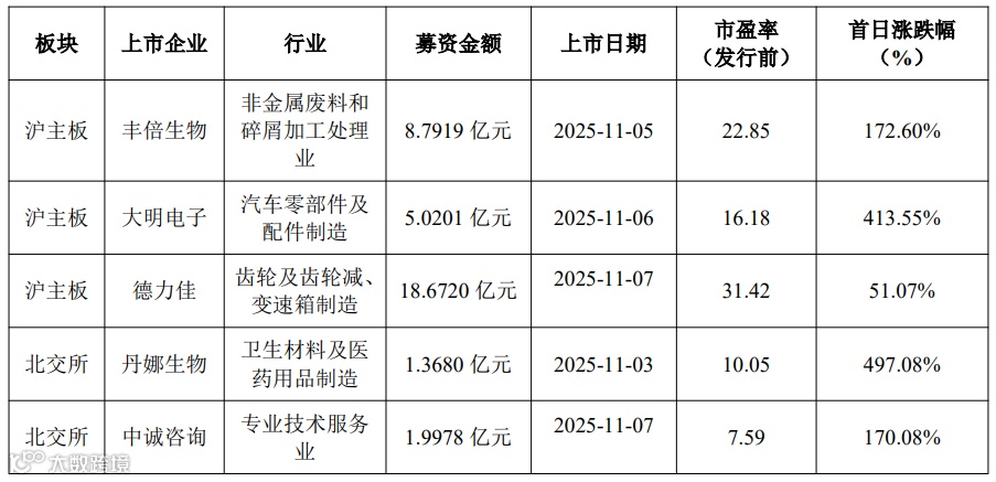 2025年11月3日至2025年11月9日共有5家IPO企业发行上市,具体情况如下。