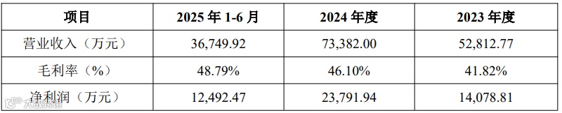 报告期内,公司营业收入分别为52,812.77万元、73,382.00万元和36,749.92万元,毛利率分别为41.82%、46.10%和48.79%,净利润分别为14,078.81万元、23,791.94万元和12,492.47万元。