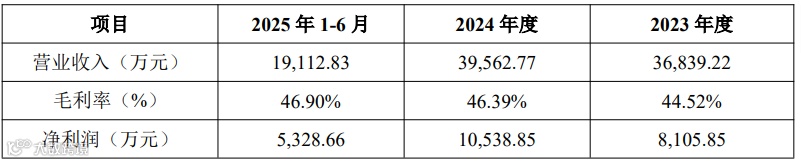 报告期内,公司营业收入分别为36,839.22万元、39,562.77万元和19,112.83万元,毛利率分别为44.52%、46.39%和46.90%,净利润分别为8,105.85万元、10,538.85万元和5,328.66万元。