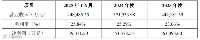 报告期内,公司营业收入分别为444,181.59万元、371,533.98万元和248,485.55万元,毛利率分别为23.66%、25.29%和25.84%,净利润分别为63,395.60万元、53,378.55万元和39,371.50万元。