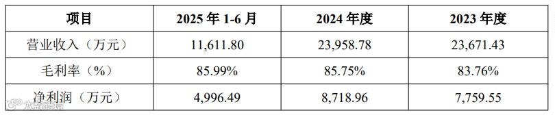 报告期内,公司营业收入分别为23,671.43万元、23,958.78万元和11,611.80万元,毛利率分别为83.76%、85.75%和85.99%,净利润分别为7,759.55万元、8,718.96万元和4,996.49万元。
