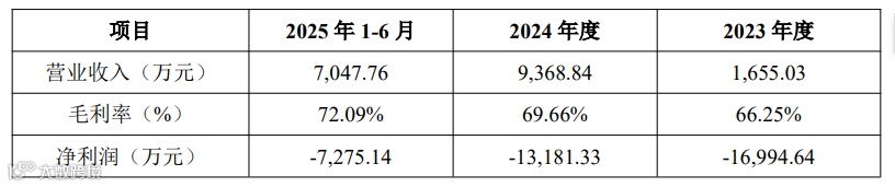 报告期内,公司营业收入分别为1,655.03万元、9,368.84万元和7,047.76万元,毛利率分别为66.25%、69.66%和72.09%,净利润分别为-16,994.64万元、-13,181.33万元和-7,275.14万元。