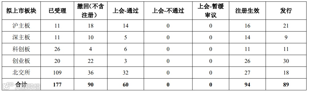 截止2025年11月9日,年度IPO受理数量为177家(其中沪主板11家,科创板26家、深主板11家、创业板20家、北交所109家)、撤回数量为90家、上会60家(其中,通过60家)、94家获得发行批文、89家成功发行上市。