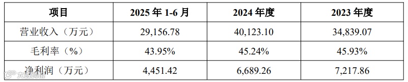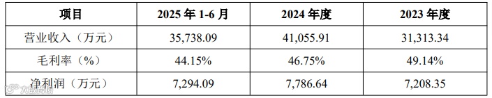 报告期内,公司营业收入分别为34,839.07万元、40,123.10万元和29,156.78万元,毛利率分别为45.93%、45.24%和43.95%,净利润分别为7,217.86万元、6,689.26万元和4,451.42万元。