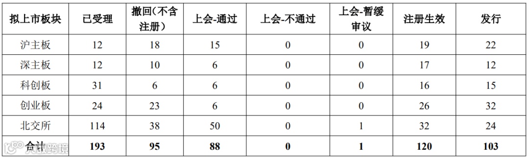 截止2025年12月21日,年度IPO受理数量为193家(其中沪主板12家,科创板31家、深主板12家、创业板24家、北交所114家)、撤回数量为95家、上会89家(其中,通过88家)、120家获得发行批文、103家成功发行上市。