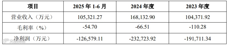 报告期内,公司营业收入分别为104,371.92万元、168,132.90万元和105,321.27万元,毛利率分别为-110.28%、-66.51%和-54.70%,净利润分别为-191,711.34万元、-232,723.92万元和-126,579.11万元。