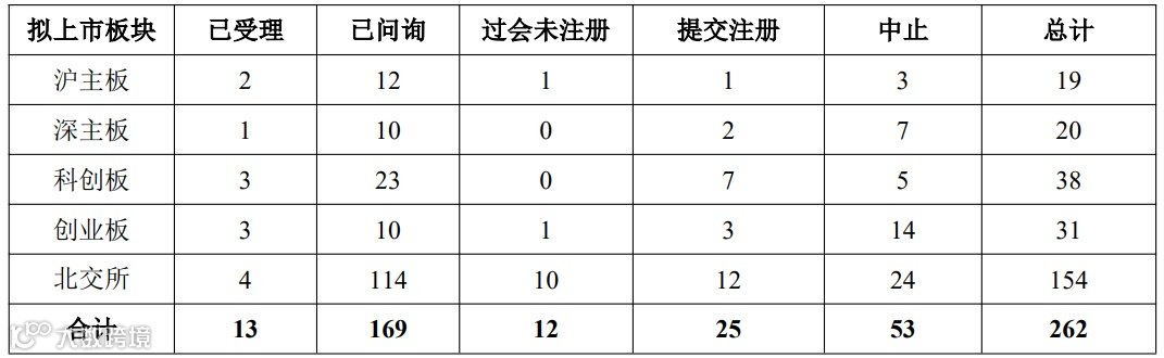 截止2025年12月21日,IPO排队情况:共262家,其中沪市主板19家,深市主板共20家,科创板共38家,创业板共31家,北交所共154家。
