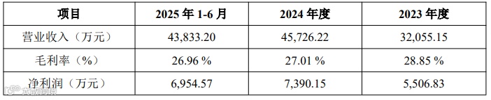 报告期内,公司营业收入分别为32,055.15万元、45,726.22万元和43,833.20万元,毛利率分别为28.85 %、27.01 %和26.96 %,净利润分别为5,506.83万元、7,390.15万元和6,954.57万元。