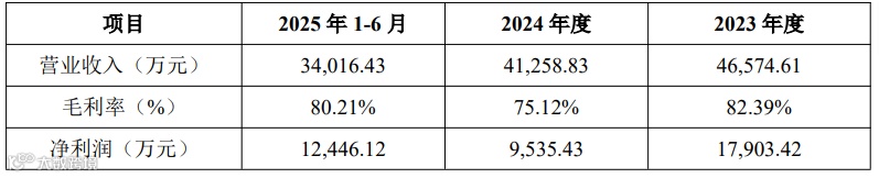 报告期内,公司营业收入分别为46,574.61万元、41,258.83万元和34,016.43万元,毛利率分别为82.39%、75.12%和80.21%,净利润分别为17,903.42万元、9,535.43万元和12,446.12万元。