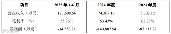 报告期内,公司营业收入分别为5,302.12万元、74,307.16万元和123,608.56万元,毛利率分别为62.88%、53.43%和55.76%,净利润分别为-87,115.82万元、-140,887.94万元和-34,550.21万元。