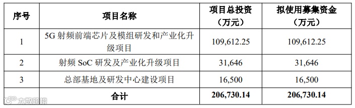 公司的募集资金主要投向为5G射频前端芯片及模组研发和产业化升级项目、射频SoC 研发及产业化升级项目、总部基地及研发中心建设项目。