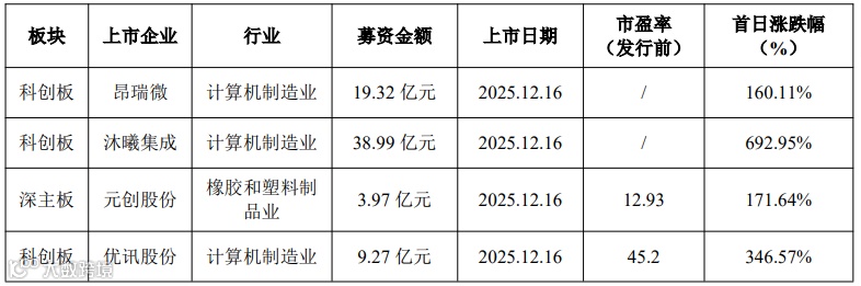 2025年12月15日至2025年12月21日共有4家IPO企业发行上市,具体情况如下。