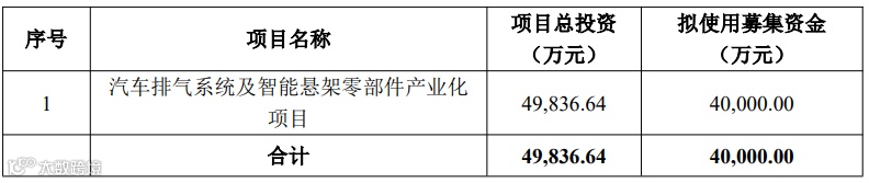本募投项目计划投资49,836.64 万元,通过购置土地、厂房及配套基础设施,并引进自动化、智能化生产设备对公司现有排气系统产品的生产线进行扩产升级,同时扩大公司在智能悬架领域内相关产品的产能。项目建成后,将形成年产 435 万件汽车排气系统零部件及 396 万件智能悬架零部件的生产能力,进一步提升公司产能规模及生产效率,更好地满足市场需求,巩固公司的市场竞争力。