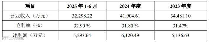 报告期内,公司营业收入分别为34,481.10万元、41,904.61万元和32,298.22元,毛利率分别为31.47%、31.80 %和32.90 %,净利润分别为5,136.63万元、6,120.49万元和5,293.64万元。