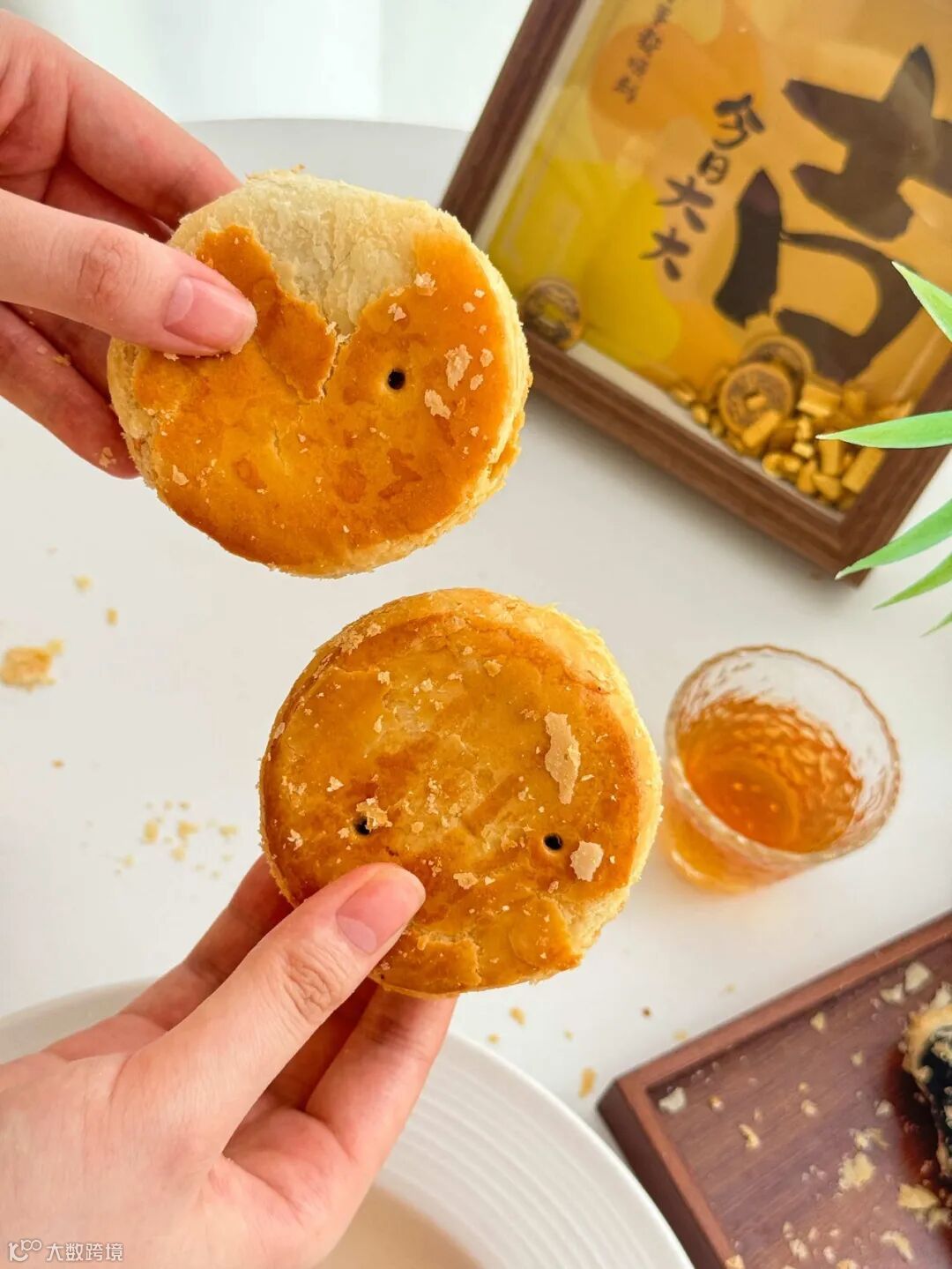 咬一口,唇齿间疏松绵润,连手心掉落的碎屑都不愿浪费。尤其是蛋黄口味,一打开便能闻到浓郁咸蛋黄香,掰开后几乎全是蛋黄,用料十足,且不会像广式月饼那样吃一个就腻。