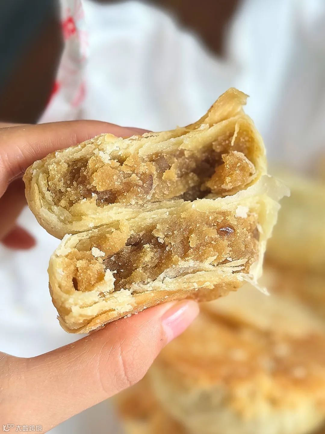 千层酥皮由老师傅手工擀制,层次清晰,金黄焦香。
