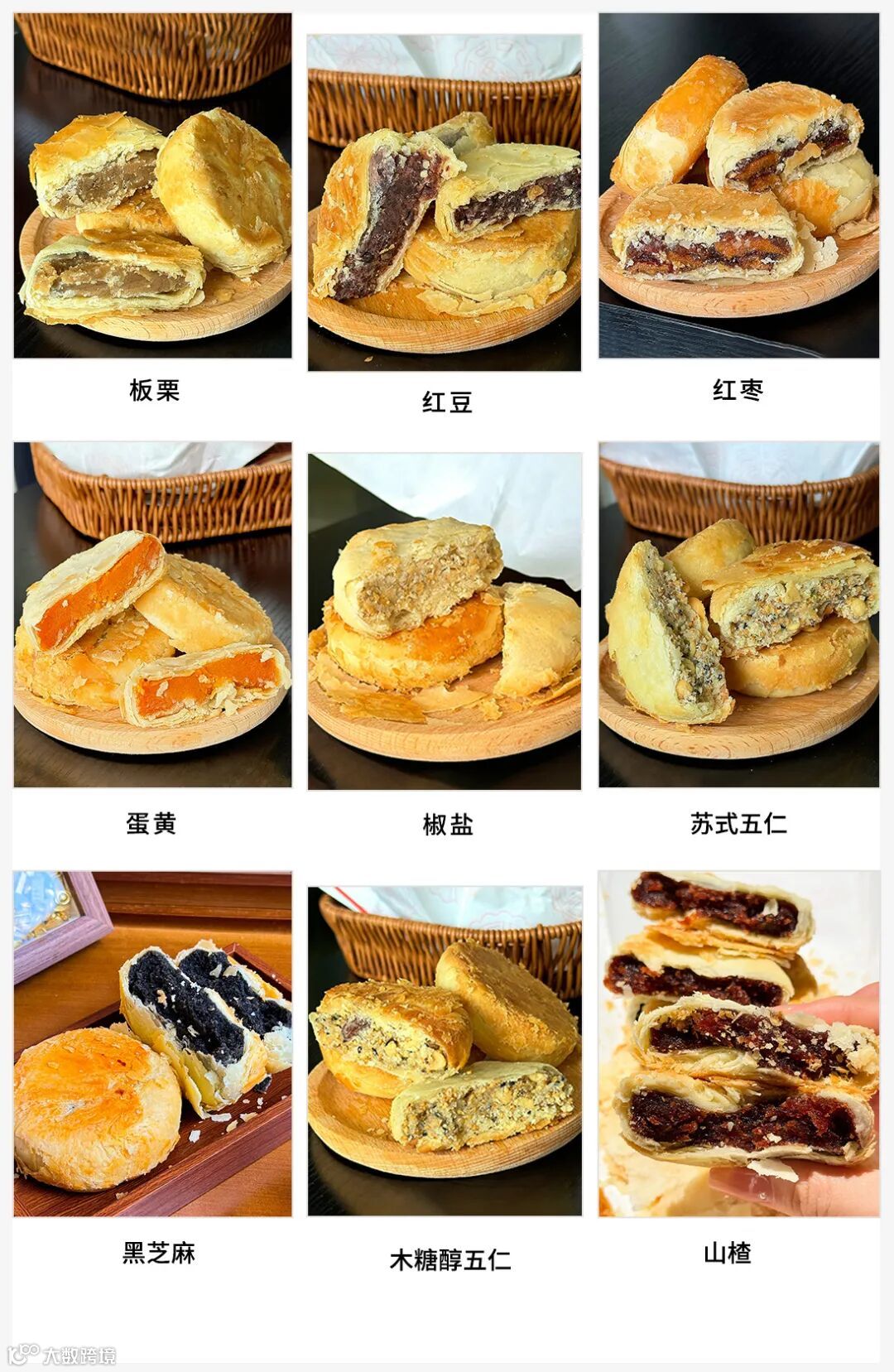 共提供9种口味:苏式蛋黄、椒盐、苏式木糖醇五仁、苏式红豆、山楂、板栗、黑芝麻、红枣、苏式五仁。