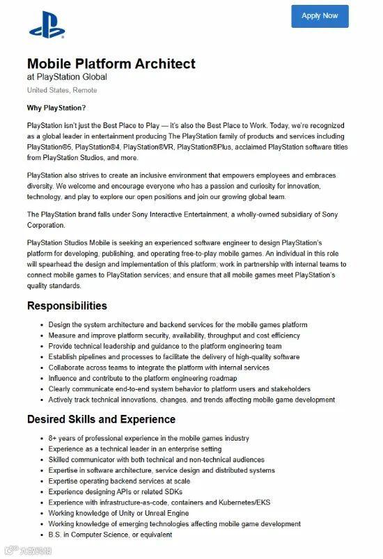 索尼在招聘信息中写道:“PlayStation Studios Mobile正在寻找一位经验丰富的软件工程师来设计PlayStation的平台,用于开发、发布和运营免费手机游戏。担任此职务的个人将带头设计和实施该平台;与内部团队合作,将手机游戏连接到PlayStation服务;并确保所有手机游戏都符合PlayStation的质量标准。”TweakTown表示,该职位列表的措辞方式可能针对的是实际的游戏开发平台,而不完全是销售手机游戏和微交易的平台。